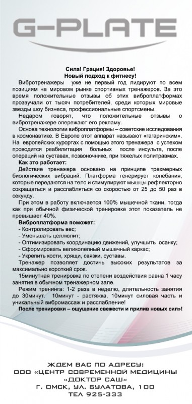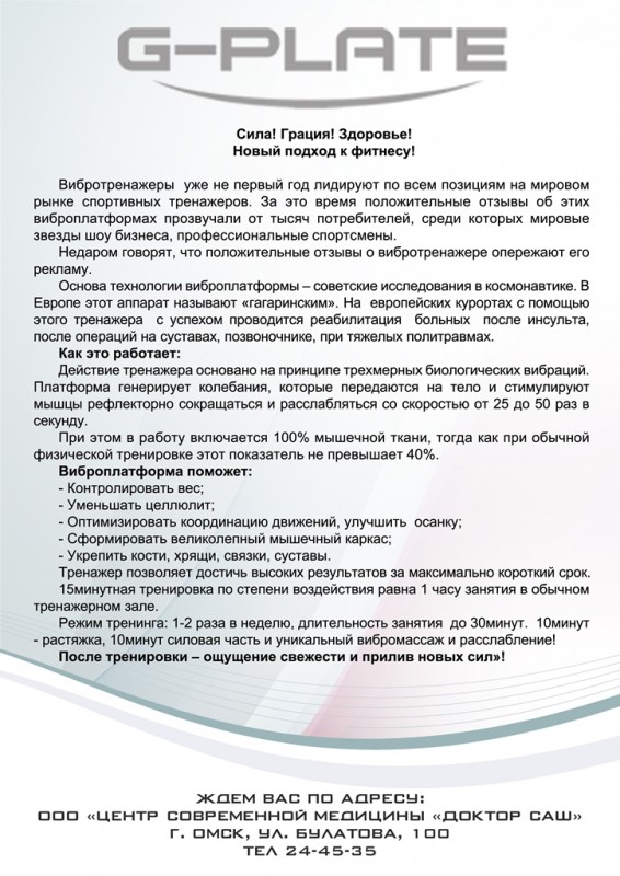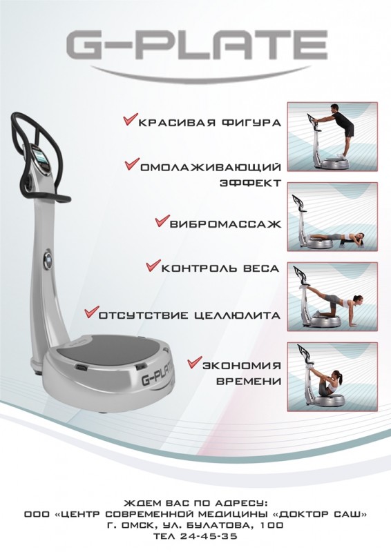 Виброплатформа — это аппарат для тренировки мышц всего тела! При занятиях на этом тренажере активизируется до 97% мышц. Тренировки положительно влияют на сухожилия, костные ткани, нервную систему, сосуды и гормональный баланс. Виброплатформа активирует метаболические процессы, иммунную систему. Укрепление мышц способствует повышению тонуса и эластичности кожи.
